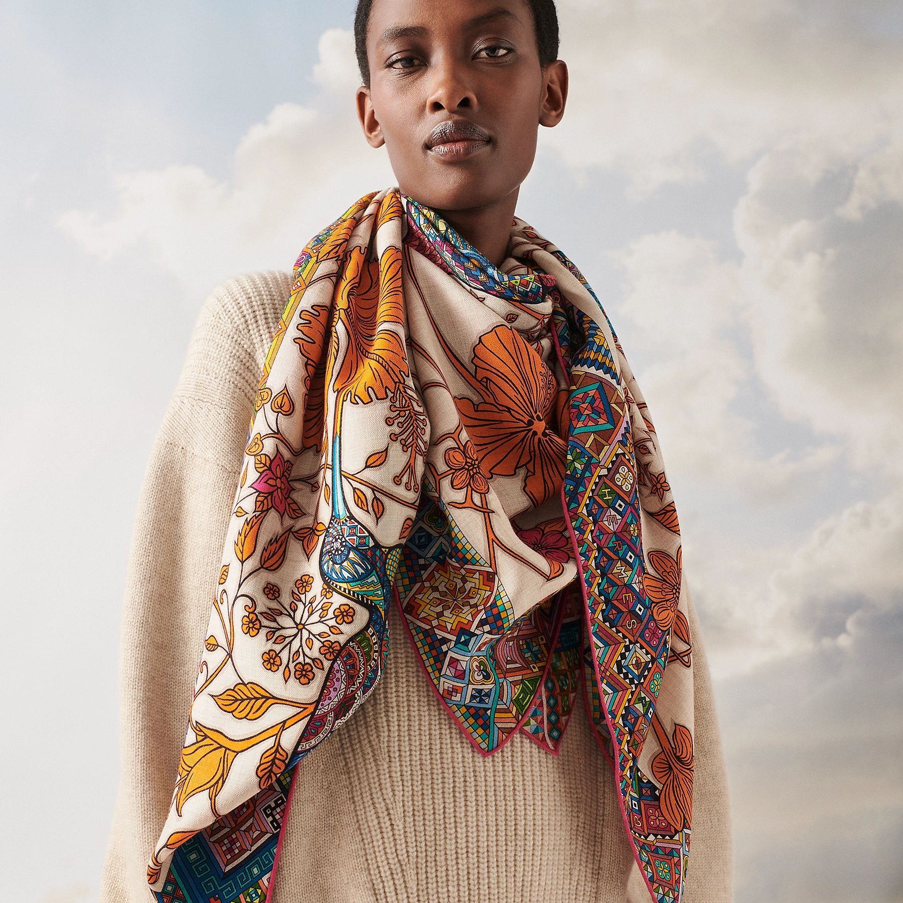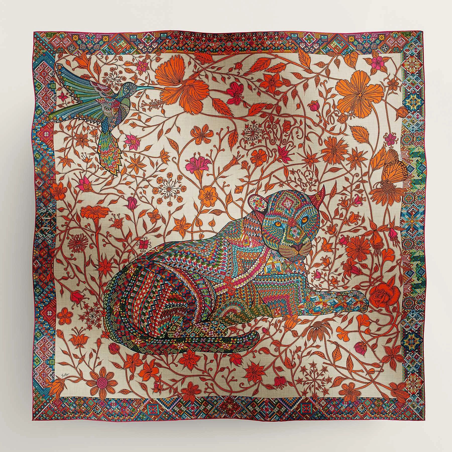 This is the story of how a strong and spirited jaguar met a delicate and joyful hummingbird. What they said to each other, no one knows. But they lived side by side in harmony for a long time. This scarf could be the precious illustration of such a tale. Montserrat Lugo depicts the two animals like jewels amid lush and vigorous vegetation whose movements echo the jaguar's coat and the bird's plumage. This touching scene sets the stage for contemplating dreams, the definitions of happiness, and the freedom found in choosing joy.